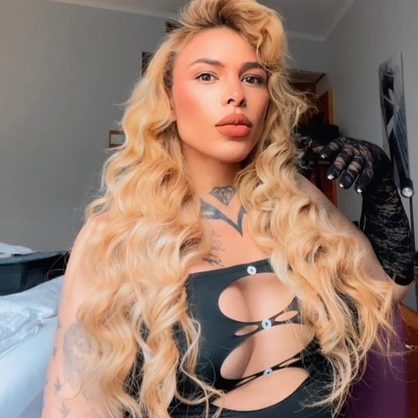 Haare:blond, rückenlang, wellig